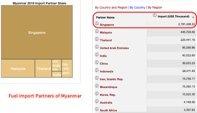 သို့သော် ရေနံထွက်ပြီး ရေနံတွင်းများရှိသော မြန်မာနိုင်ငံသည် ရေနံမထွက်၊ ရေနံတွင်းများ မရှိသော စင်ကာပူနိုင်ငံမှ တစ်နှစ်လျှင် ဒေါ်လာ သန်းပေါင်းများစွာ ရေနံများကို ဝယ်ယူတင်သွင်းနေရလေ၏။